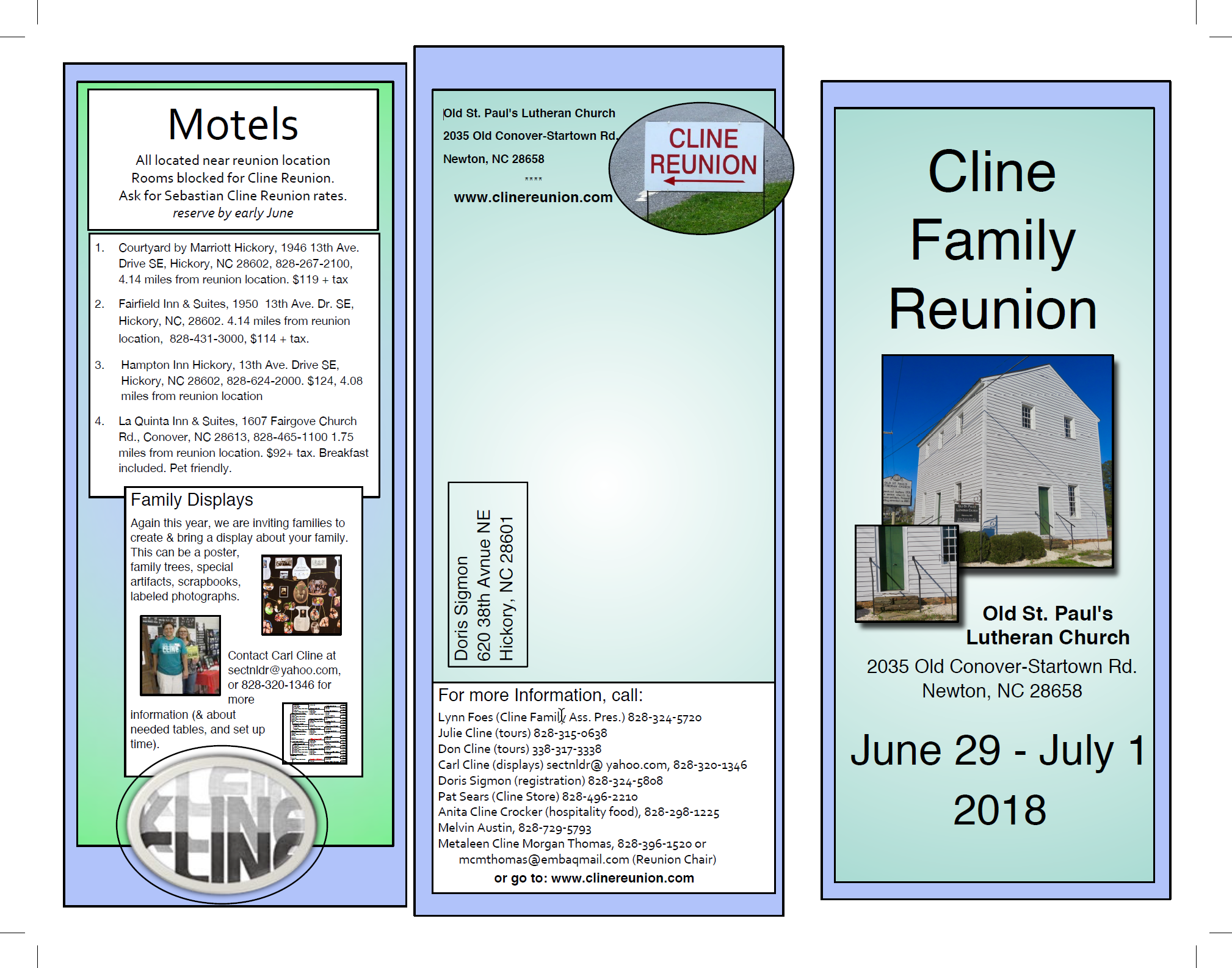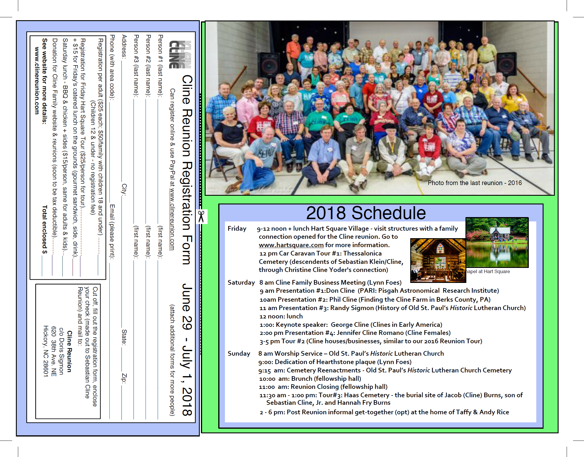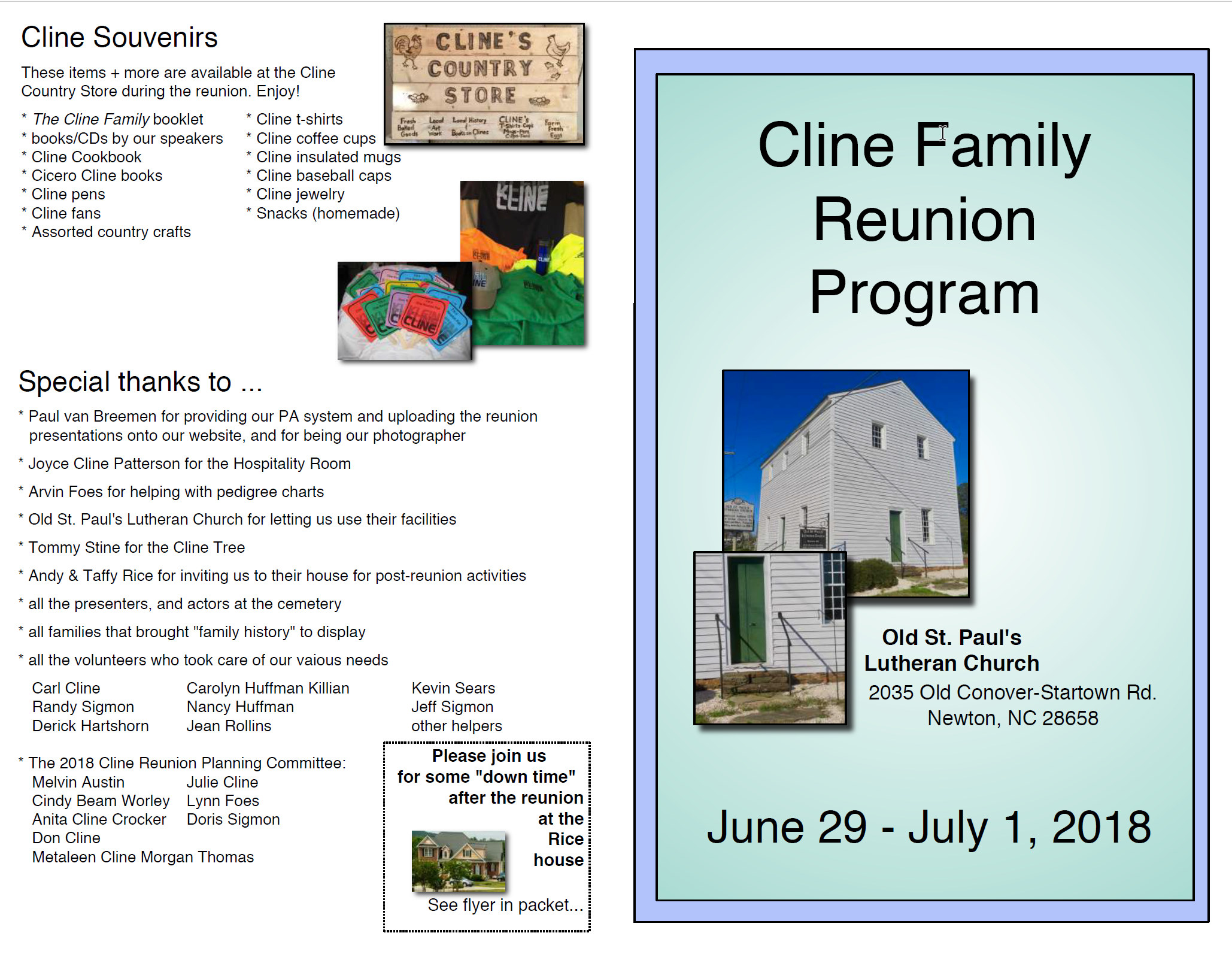 Plan to join us for Food, Fellowship, Historical Tours, Genealogy Discussions & Research, Find your Relatives, Cookbooks, Souvenirs, and Fun! We are hoping to highlight Cline females at the 2018 Reunion, and are asking you to contact Jennifer Cline Romano (908-723-2349 or jenniferromano@icloud.com) with stories or information about females in your Cline line.